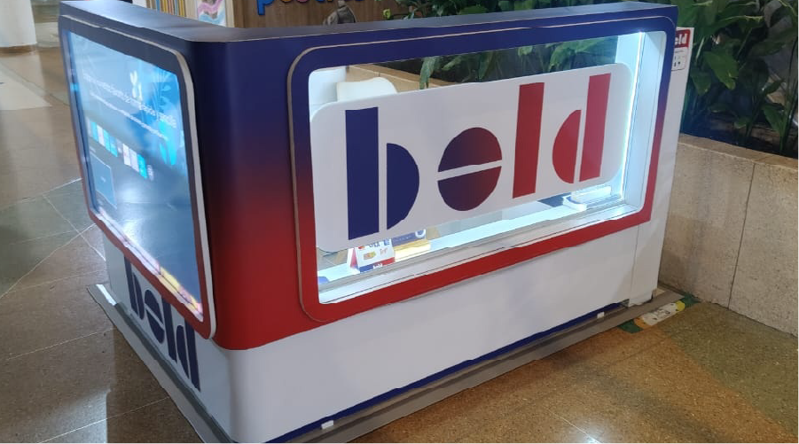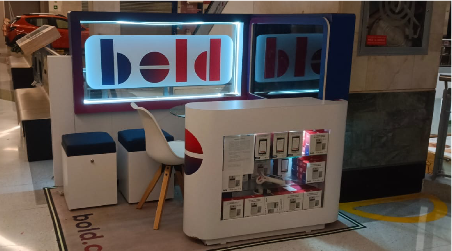 El diseño de cada isla incorpora una estética moderna, destacando por el uso de colores degradados característicos de Bold, combinados con superficies limpias, esquinas redondeadas y acabados de alta calidad. Estos elementos no solo fortalecen el reconocimiento de marca, sino que también generan un ambiente visualmente atractivo y coherente con su estilo innovador y tecnológico.