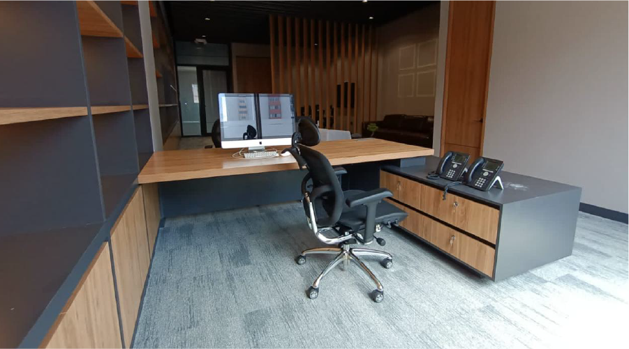 El mobiliario fue diseñado con líneas modernas y materiales nobles como la madera, logrando un equilibrio entre elegancia y practicidad. Se incorporaron escritorios ejecutivos, mesas de juntas, estaciones de trabajo y áreas de reunión informal, todo con una disposición que favorece la circulación y la colaboración.
