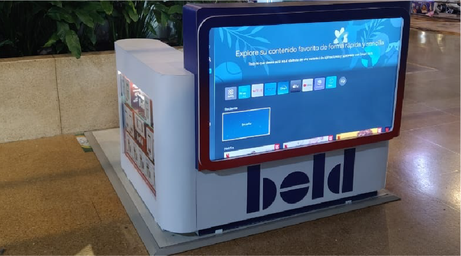 El diseño de cada isla incorpora una estética moderna, destacando por el uso de colores degradados característicos de Bold, combinados con superficies limpias, esquinas redondeadas y acabados de alta calidad. Estos elementos no solo fortalecen el reconocimiento de marca, sino que también generan un ambiente visualmente atractivo y coherente con su estilo innovador y tecnológico.